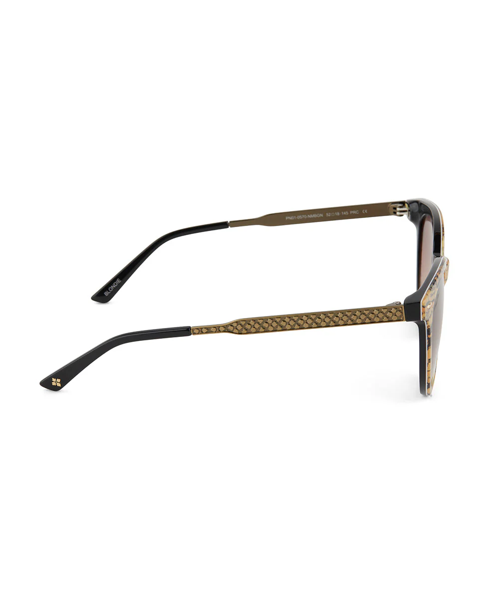 - Temple: Handcut acetate tip in Black, stainless steel in brushed brass